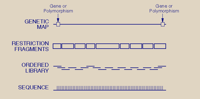 At the coarsest resolution, the genetic map measures recombination frequency between linked markers (genes or polymorphisms). At the next resolution level, restriction fragments of 1 to 2 Mb can be separated and mapped. Ordered libraries of cosmids and YACs have insert sizes from 40 to 400 kb. The base sequence is the ultimate physical map. Chromosomal mapping (not shown) locates genetic sites in relation to bands on chromosomes (estimated resolution of 5_Mb); new in situ hybridization techniques can place loci 100 kb apart. This direct strategy links the other four mapping approaches. [Source: see Fig. 9.]
